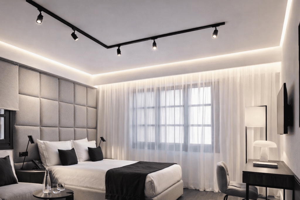 Nereikia apsiriboti vienu variantu. Moderniame interjere dažnai derinami keli tipai: pavyzdžiui, „sklandančios“ lubos svetainės perimetru vakariniam jaukumui, o magnetiniai bėgeliai – virš valgomojo stalo ryškiai šviesai.
